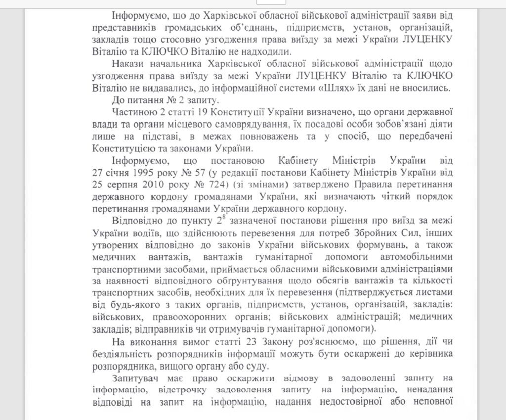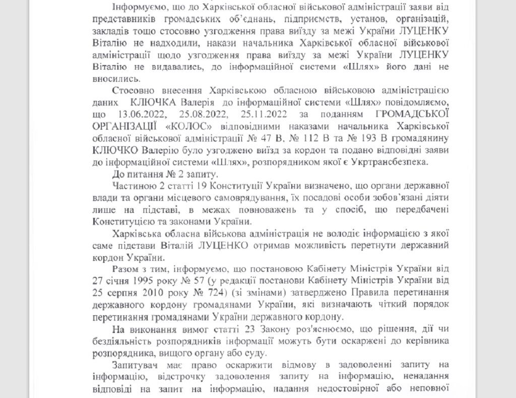 "Что касается внесения Харьковской областной военной администрацией данных Ключко Валерия в информационную систему "Шлях" сообщаем, что 13.06.2022, 25.08.2022, 25.11.2022 по представлению общественной организации "КОЛОС" соответствующими приказами начальника Харьковской областной военной администрации №47В, №112В, №193В гражданину Ключко Валерию был согласован выезд за границу и поданы соответствующие заявления в информационную систему "Шлях", – цитирует "Апостроф" официальный ответ Харьковской ОВА.