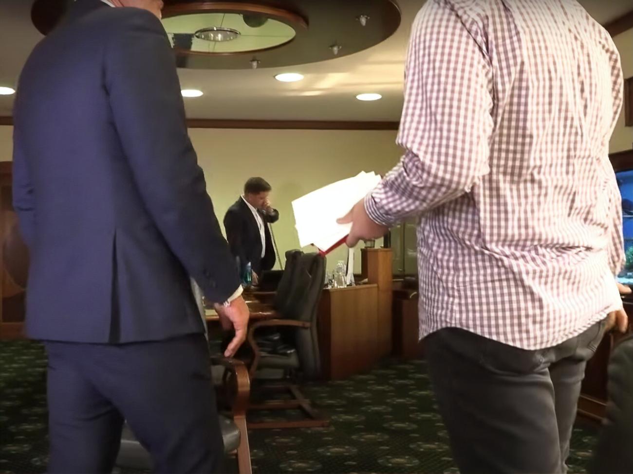 В это время директор департамента информполитики финучреждения Владимир Пикалов начал мешать сьемке.