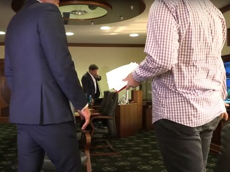После этого сотрудники "Укрэксимбанка" унесли технику СМИ, но не выключили режим записи. Между ними слышен разговор, что надо вытереть все с видеокамеры. После этого камера выключилась.