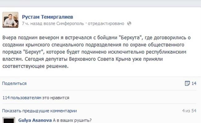 "…я встречался с бойцами "Беркута", где договорились о создании крымского специального подразделения по охране общественного порядка "Беркут", которое будет подчинено исключительно республиканским властям… депутаты Верховного Совета Крыма уже приняли соответствующее решение", – написал Темиргалиев у себя в Facebook.