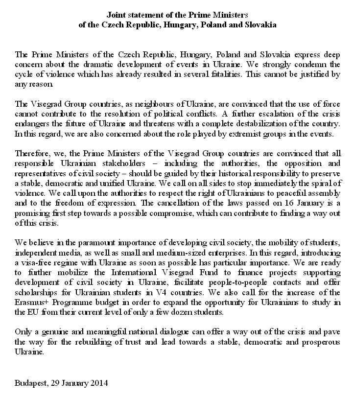 Страны "Вышеградской группы" (Венгрия, Польша, Словакия, Чехия) готовы ускорить введение безвизового режима с Украиной и направить дополнительные средства на развитие гражданского общества в стране. Об этом говорится в совместном заявлении глав правительств стран по итогам состоявшегося вечером 29 января внеочередного саммита в Будапеште.