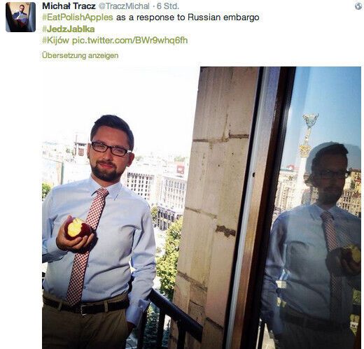 Ешь яблоки назло Путину – онлайн-флешмоб, к которому присоединились журналисты, политики и просто граждане Польши. В Twitter начали появляться фотографии поляков, которые позируют с надкушенными яблоками, выступая против запрета Россельхознадзора ввозить в РФ польские яблоки.