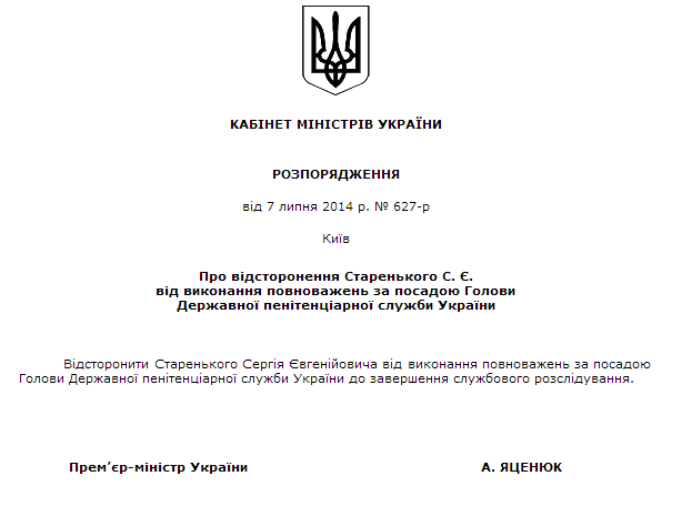 Яценюк отстранил главу Государственной пенитенциарной службы от выполнения обязанностей