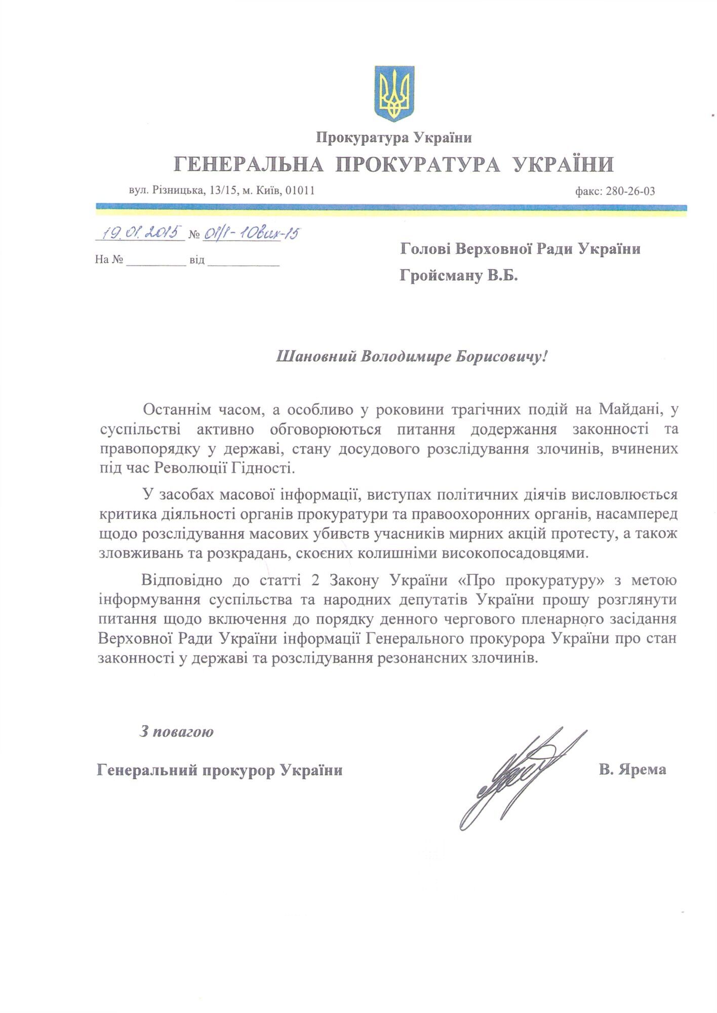 19 января генеральный прокурор Украины Виталий Ярема обратился к председателю Верховной Рады Владимиру Гройсману с просьбой заслушать его в парламенте. Об этом сообщает пресс-служба ГПУ.