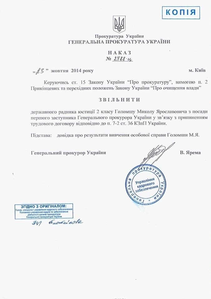Генеральный прокурор Украины Виталий Ярема подписал приказ об увольнении Голомши в рамках выполнения закона о люстрации.