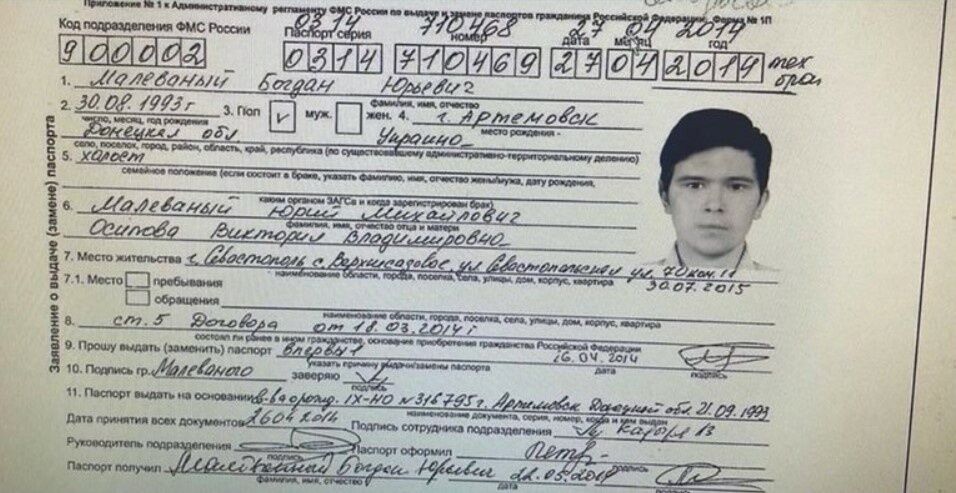 Она опубликовала заявление в Федеральную миграционную службу России, в котором Малеваный в 2014 году якобы просил выдать ему российский паспорт, а также водительское удостоверение, выданное в 2014 году, где указан адрес водителя в Ростове-на-Дону.