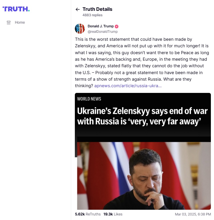 На слова Зеленского отреагировал 3 марта в своей соцсети Truth Social президент США Дональд Трамп. Он показал заголовок новости о Зеленском от AP, в котором говорится, что якобы "Зеленский заявил, что окончание войны с Россией "очень, очень далеко" (на самом деле речь шла о соглашении о мире).