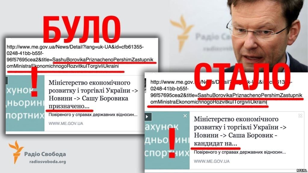 В публикации "Радіо Свобода" приводятся два скриншота новости о Боровике с сайта Минэкономразвития – старый и новый.