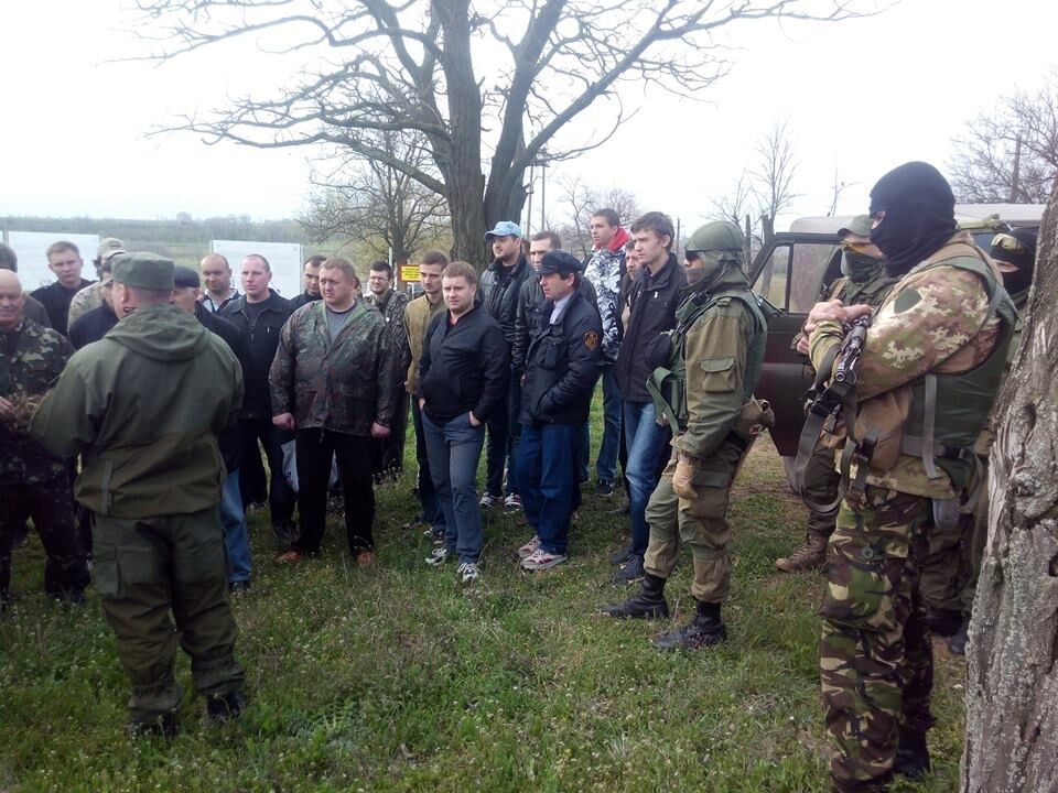 14.05 Сторонники Донецкой республики в Мариуполе обсуждают причины провала штурма военной части.