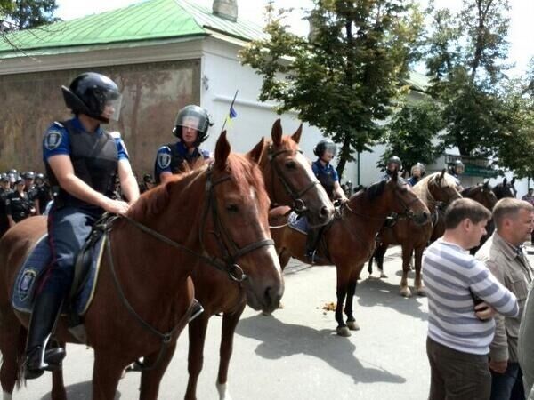 12.15 В Киеве возле Лавры, где планировалось проведение митинга за прекращение АТО, собралось большое количество милиции и активистов с украинскими флагами.