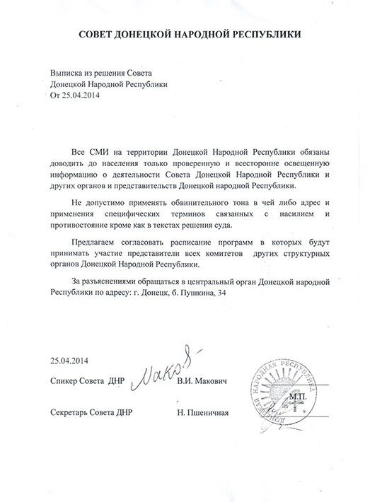 18.24 Сепаратисты решили ввести цензуру. Такое обращение сегодня они вручили представителям сайта 62.ua.