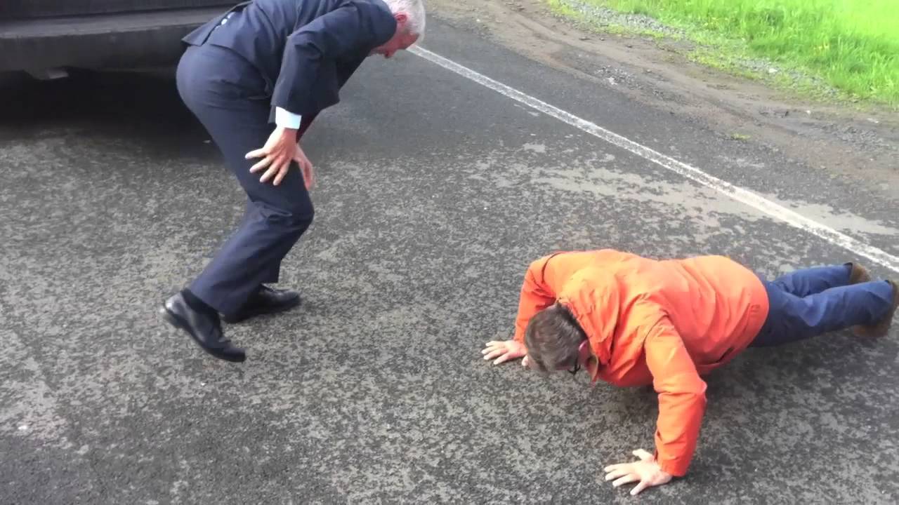 В интернете появилась видеозапись, зафиксировавшая, как генеральный секретарь Совета Европы Турбьерн Ягланд и губернатор Донецкой области Сергей Тарута соревновались в отжимании, пока ждали на дороге заложников, которых должны были привезти из Славянска.