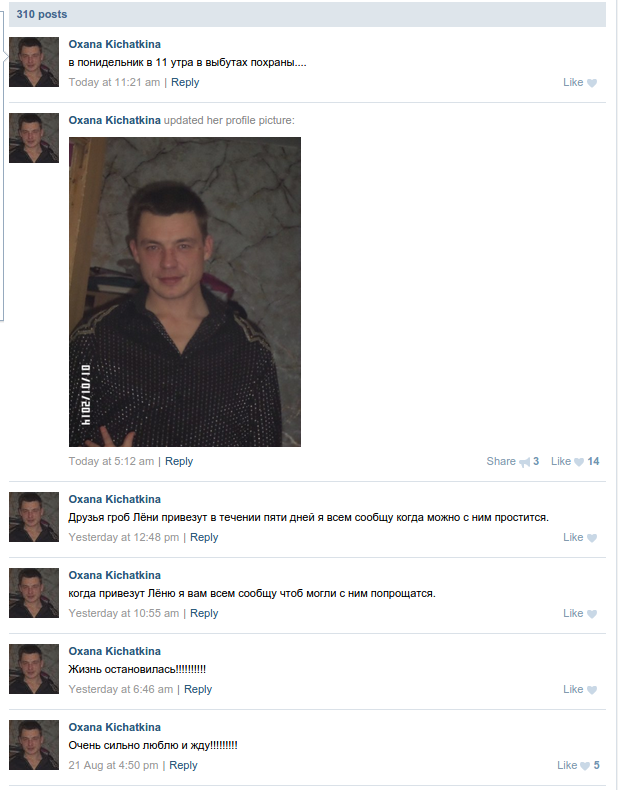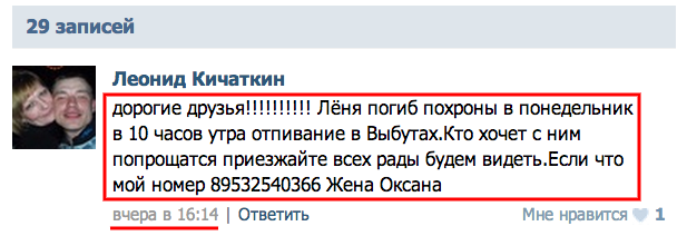 23 августа на странице Кичаткина в соцсети появилось сообщение от его жены о том, что он погиб и похороны состоятся в Выбутах.