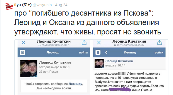 На следующий день страницу десантника и скорбные статусы удалили, а его жена написала у себя, что "муж жив-здоров, отмечаем крестины дочери". Несколько человек в этот день позвонили Оксане Кичаткиной и поговорили с ней и мужчиной, назвавшимся живым Леонидом, который заявил, что слухи о его смерти – это недоразумение.