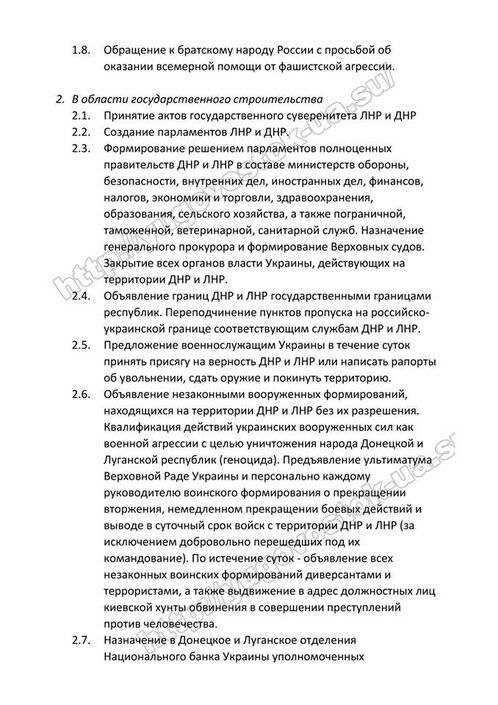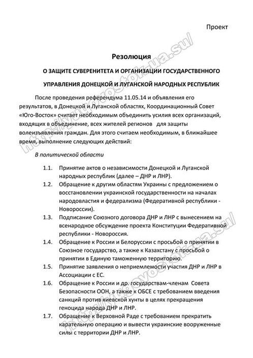 В резолюции, в частности, сказано, что члены движения в ближайшее время планируют принять акты о независимости так называемых "Донецкой народной республики" и "Луганской народной республики", которые впоследствии будут объединены в Федеративную республику Новороссию.