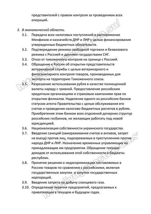 В экономической сфере сепаратисты, в частности, хотят запретить добычу сланцевого газа, национализировать украинские предприятия и отказаться от таможенного контроля на границе с Россией.
