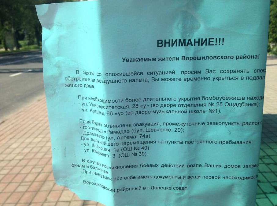 Сегодня на улицах Донецка появились листовки, в которых гражданам сообщали адреса ближайщих бомбоубежищ и пунктов эвакуации.