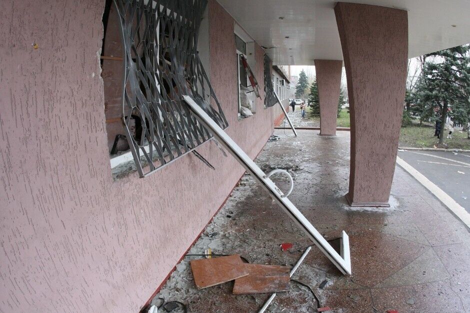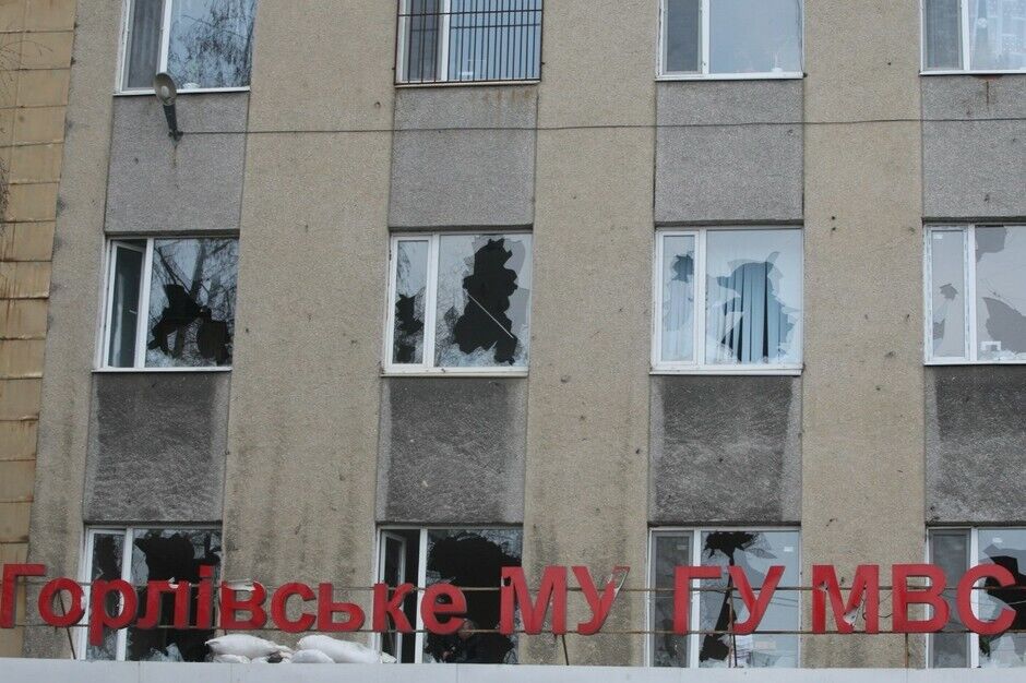 В здании горловской милиции, которое сегодня утром захватили сепаратисты, выбиты многие окна (даже на втором этаже), выломаны железные решетки. Здание охраняют несколько десятков вооруженных битами людей с георгиевскими ленточками. Над милицией развивается флаг так называемой "Донецкой республики".