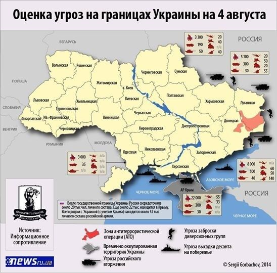 На 4 августа сохраняется угроза российского вторжения в Украину, карту расположения войск РФ на границах опубликовал в Facebook координатор группы "Информационное сопротивление" Дмитрий Тымчук.