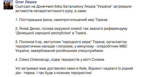 Сепаратистов задержали бойцы батальона "Украина", сообщает кандидат в президенты Олег Ляшко.
