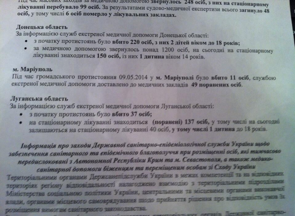 В то же время издание "Новости Донбасса" опубликовало выдержки из отчета Минздрава о ситуации в двух восточных областях. В документе говорится, что с начала противостояния в Донецкой области погибли 220 человек (из них – двое детей до 18 лет), в Луганской – 37 человек.
