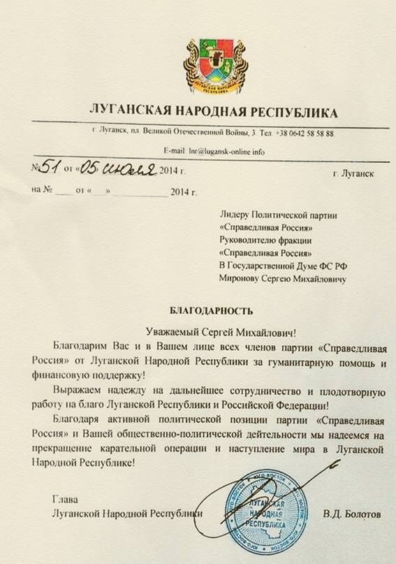В частности, МВД ссылается на размещенное на сайте "Справедливой России" письмо лидера луганских боевиков Валерия Болотова, в котором он благодарит Миронова за предоставление гуманитарной помощи и финансовой поддержки представителям так называемой "Луганской народной республики".