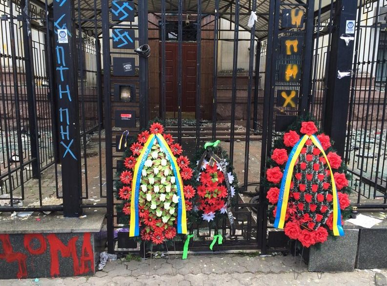 14.56 Сегодня возле российского посольства ситуация спокойная. Немногочисленные активисты принесли к воротам представительства РФ похоронные венки.