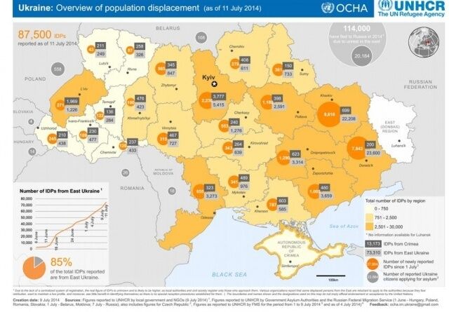 По данным на 11 июля, количество внутренних переселенцев в Украине составляет 87 500 человек. В отчете ООН учитываются только официально зарегистрированные переселенцы, реальное их число может быть больше.