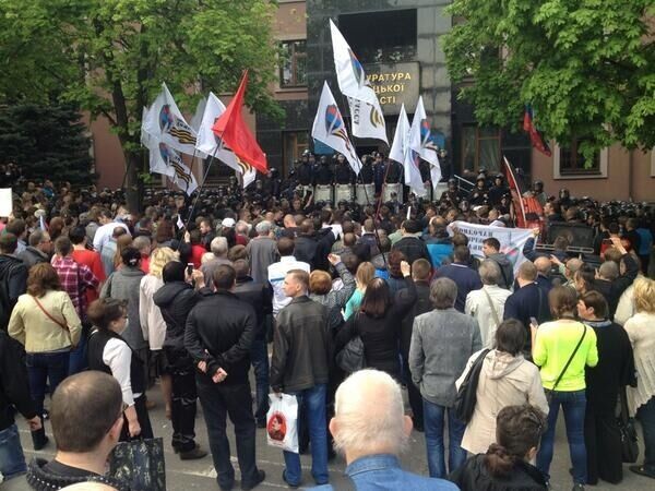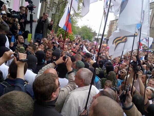 15.27 Толпа сепаратистов в Донецке подошла к областной прокуратуре и скандирует: "Прокурора!". Здание охраняется несколькими сотнями милиционеров.