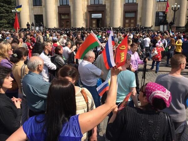 15.46 В это же время в Донецке проходит митинг сепаратистов. Одна из выступающих на нем говорит: "Я защищаю партию "Русский блок" в суде Киева и вижу, как киевляне боятся говорить на русском языке".
