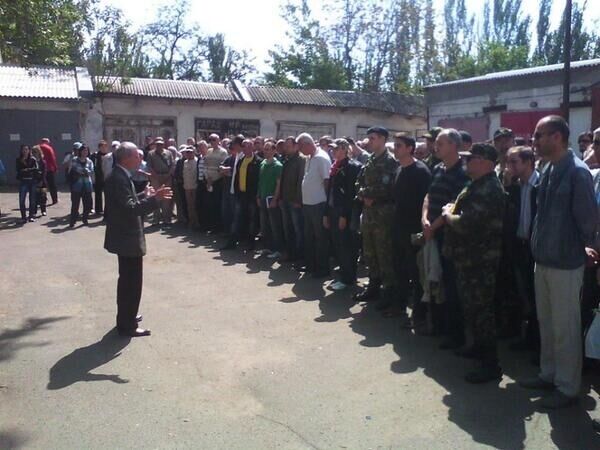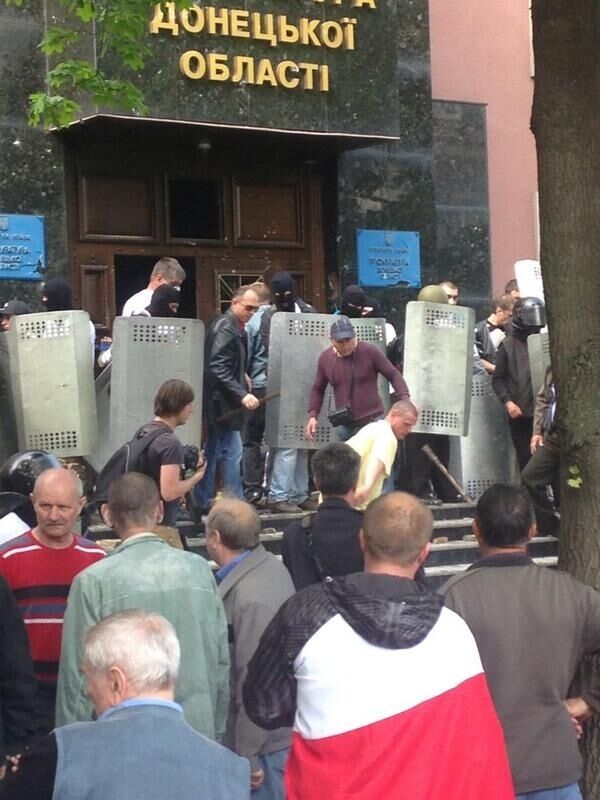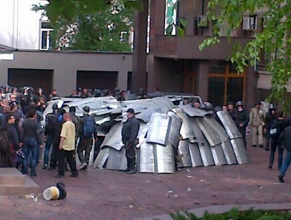 16.15 Донецкая прокуратура долго не продержалась. Милиционеры сдают сепаратистам щиты, шлемы и бронежилеты.