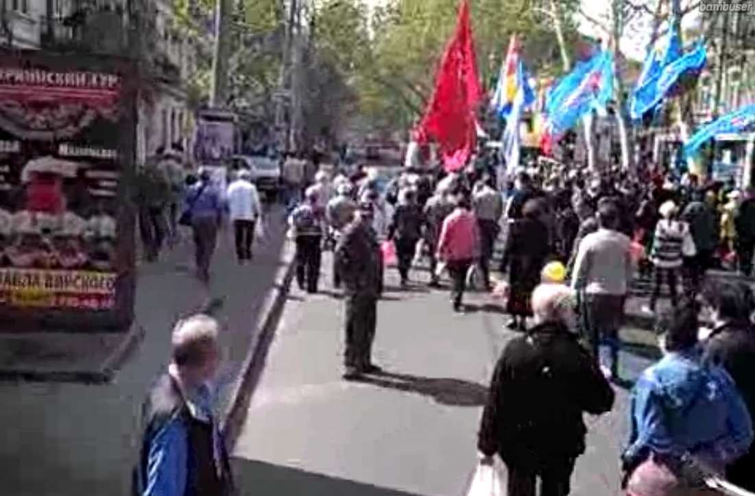 10.24 В Одессе несколько тысяч человек вышли на марш по случаю 1 Мая. Много флагов КПУ и России. Скандируют: "Россия!" и "Референдум!".