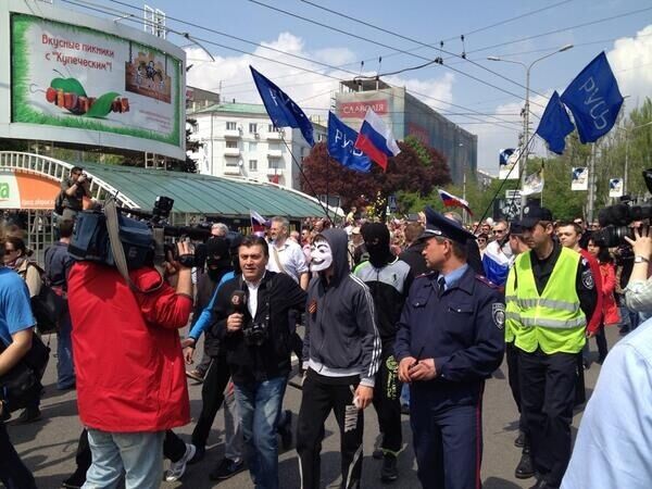 Сегодня в Москве тоже проходит первомайский митинг с лозунгами о Донецке и Луганске. Участники первомайского шествия в Москве держат плакаты "Славянск, Донецк, Луганск – мы с вами", "Юго-восток Украины, мы своих не бросаем".