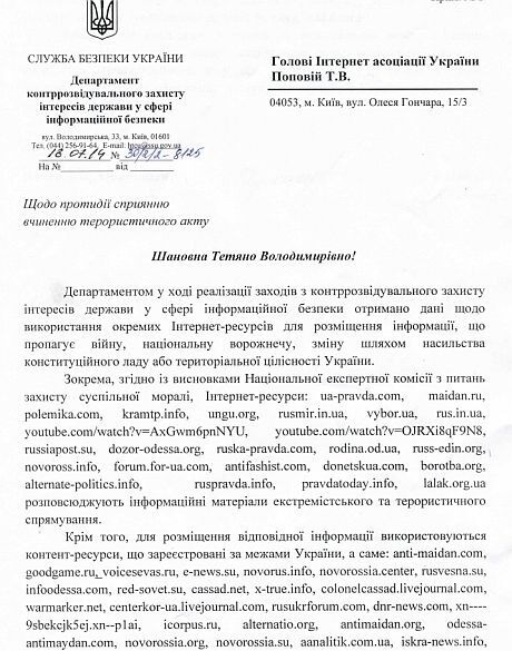 СБУ направила официальное письмо в Интернет-ассоциацию Украины с просьбой о блокировании ряда интернет-ресурсов, распространяющих информацию с пропагандой войны и национальной вражды.