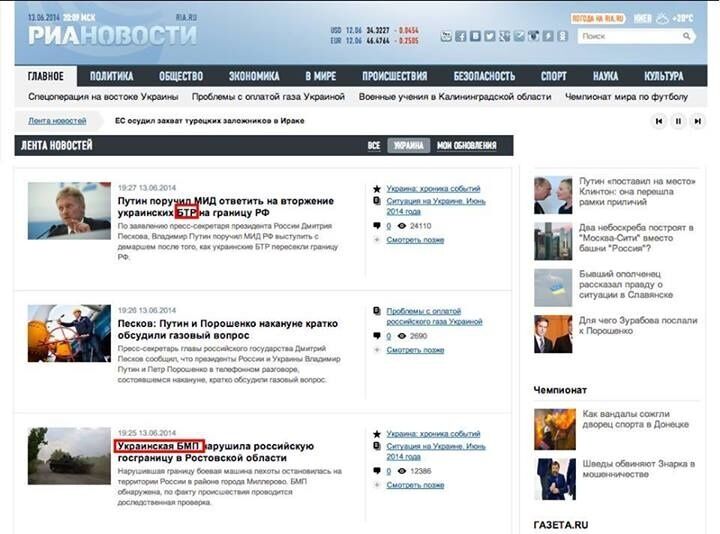 Кроме того, Селезнев отметил, что российские СМИ называют разные виды бронемашин, которые якобы проникли на территорию РФ. Он опубликовал скрин-шот российского государственного агентства "РИА Новости": в одном сообщении говорится об украинском БТР, в другом – о БМП.