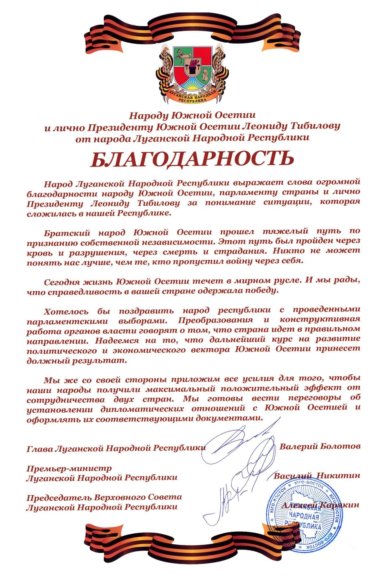 "Официальная благодарность народу Южной Осетии" была опубликована на сайте незаконной "народной республики".
