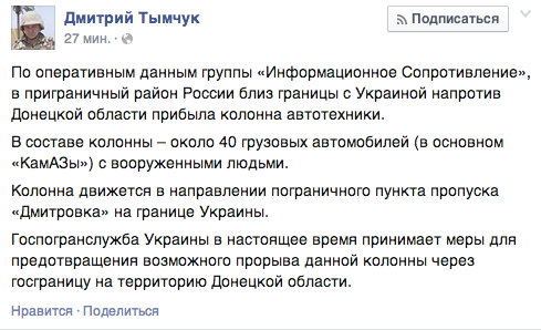 "В составе колонны – около 40 грузовых автомобилей (в основном "КамАЗы") с вооруженными людьми. Колонна движется в направлении пограничного пункта пропуска "Дмитровка" на границе Украины", – написал Тымчук.