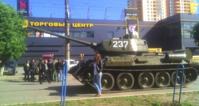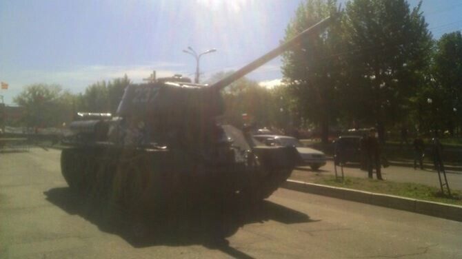 В четверг утром к зданию управления СБУ в Луганске сепаратисты подогнали танк Т-34, снятый с постамента в районе мемориального комплекса "Острая могила". По словам сепаратистов, 9 Мая танк проедет по городу в честь праздника. Луганчане активно фотографируются рядом с боевой машиной.