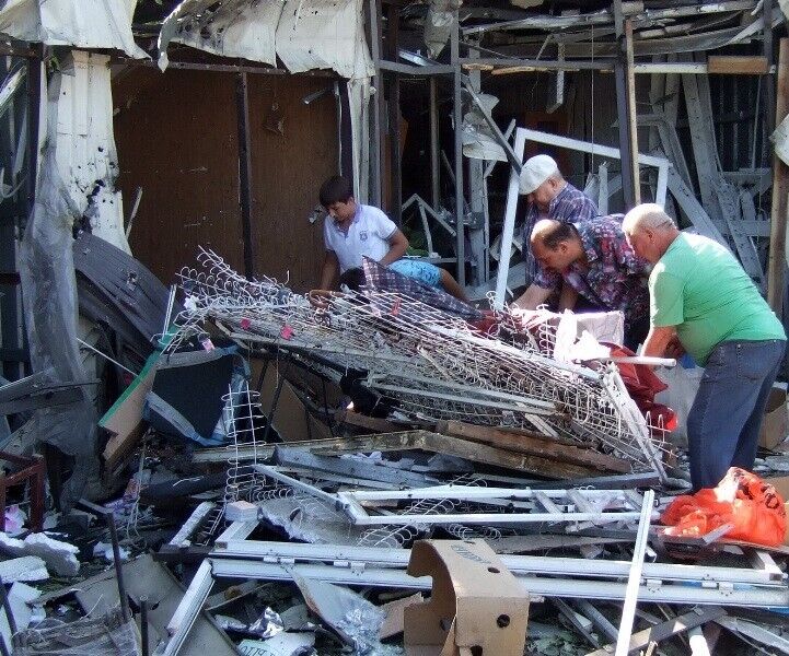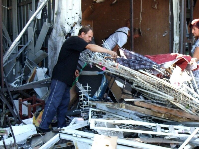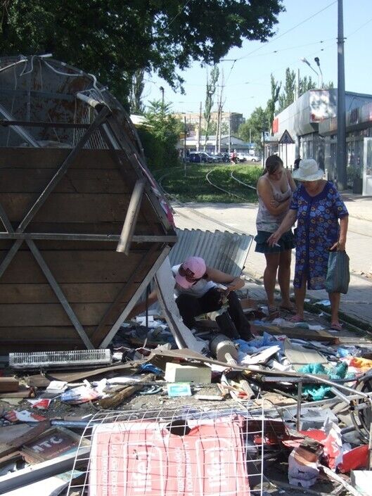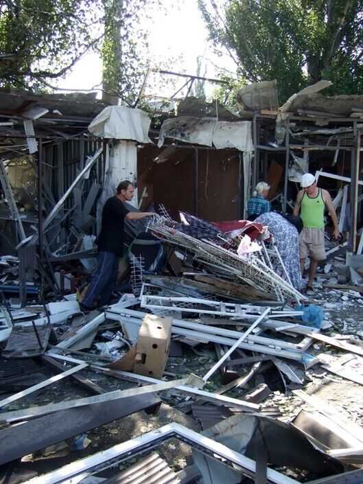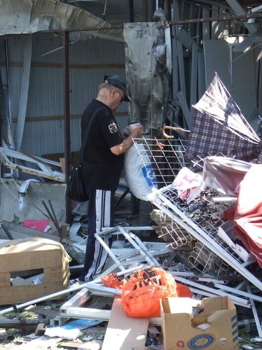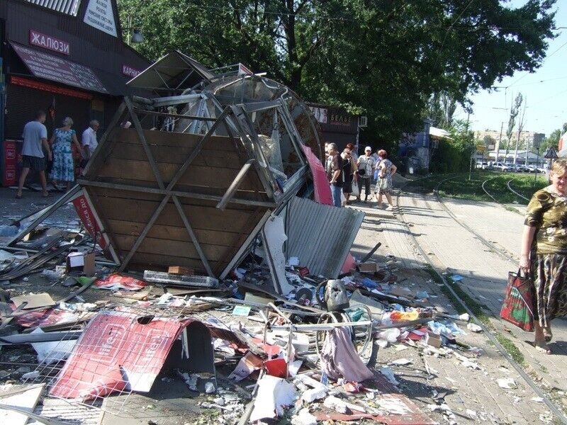 В результате очередного обстрела Донецка пострадала остановка и торговые ряды в Кировском районе города. На месте происшествия утром после обстрела появились местные жители, которые начали искать среди обломков конструкций пригодные для использования вещи.