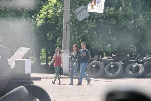 15.40 В Славянске сегодня спокойно, боев нет. Британский фотограф поймал в кадре молодежь, гуляющую по улицам под цветущими каштанами.