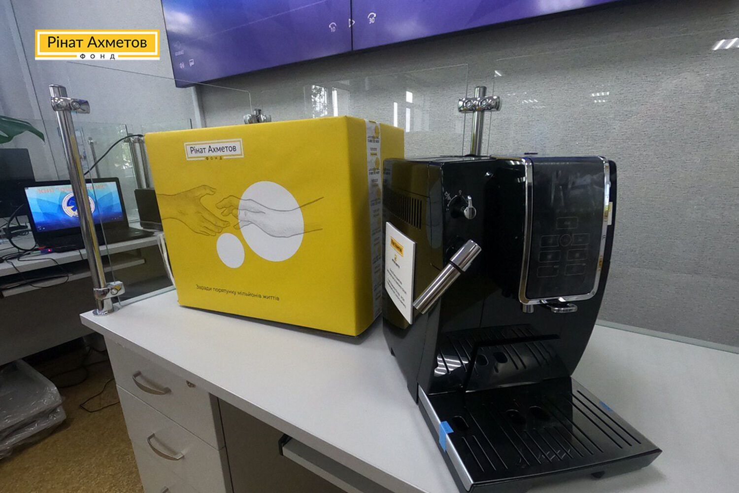 Еще одним приятным событием в завершении этого дня стала встреча в Областном центре экстренной медпомощи и медицины катастроф Краматорска. Фонд Рината Ахметова поблагодарил медиков за самоотверженный труд и также вручил подарок по случаю профессионального праздника. Заместитель директора центра Дмитрий Буренков, принимая кофемашину, вспомнил добрыми словами о переданных ранее области шести автомобилях скорой помощи от Фонда Рината Ахметова.