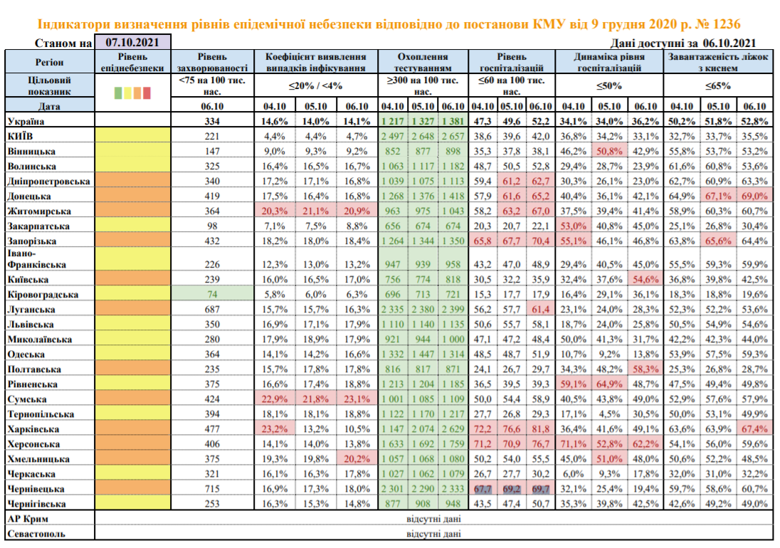 В Харьковской области три дня превышен уровень госпитализаций (72,2, 76,6 и 81,8), а также 6 октября была превышена загруженность коек с кислородом (67,4%). В Херсонской области три дня подряд превышен уровень госпитализаций (71,2, 70,9 и 76,7) и динамика госпитализаций (71,1%, 52,8% и 62,2%). В Черновицкой области три дня превышен уровень госпитализаций (67,7, 69,2 и 69,7).