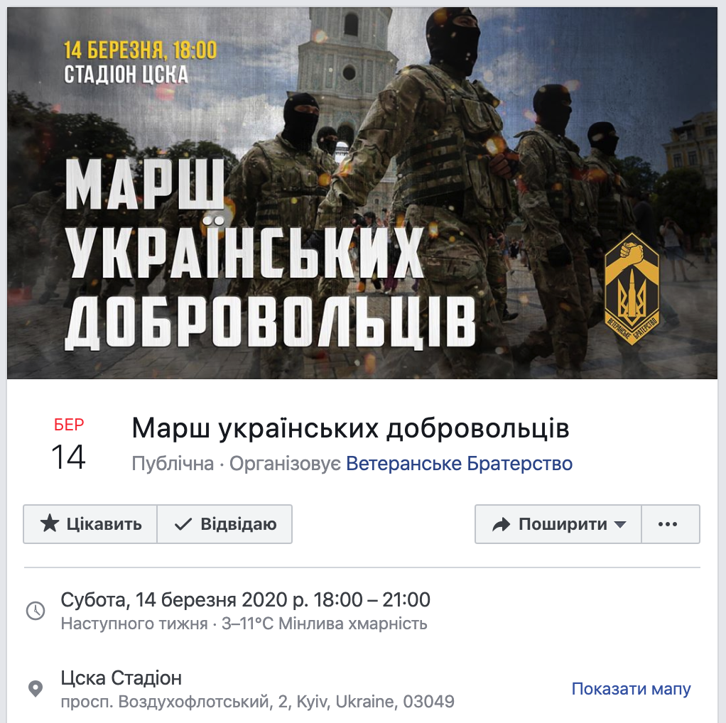 Указано, что марш организовывает "Ветеранське братерство" – объединение ветеранов, волонтеров и членов семей погибших в войне против России на востоке Украины.