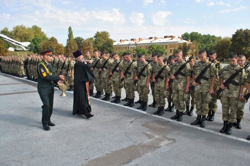 30 августа курсанты набора 2012, 2013 и 2014 годов Житомирского военного института им. Королева Государственного университета телекоммуникаций приняли присягу на верность Отечеству и всему украинскому народу, сообщает пресс-служба Минобороны. Молодых будущих офицеров благословил настоятель Свято-Крестовоздвиженского кафедрального собора УПЦ протоиерей Богдан.