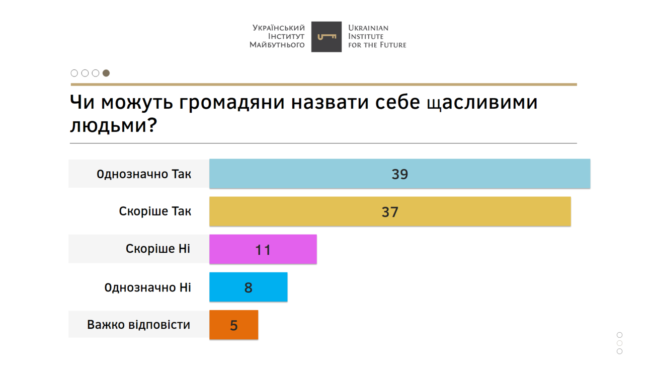 Три четвери украинцев считают себя счастливыми людьми. Об этом свидетельствуют опубликованные 18 августа результаты опроса, проведенного Украинским институтом будущего совместно с социологической компанией New Image Marketing Group.