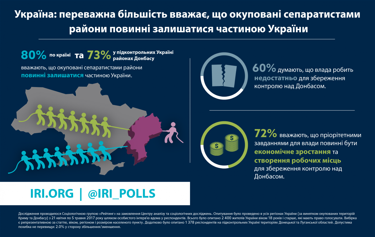 60% опрошенных в этом регионе считают, что украинское правительство не принимает достаточных мер для сохранения контроля над освобожденными районами Донбасса, и только 10% респондентов в Луганской и Донецкой областях и 13% на национальном уровне уверены, что власть делает достаточно в этом направлении.