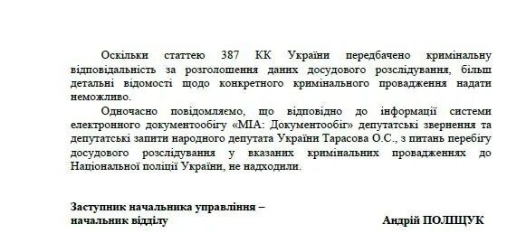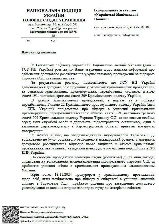 Тарасова подозревают в организации схемы вывода земель из государственной собственности через Главное управление Госгеокадастра в Кировоградской области. Нацполиция сообщает, что кроме него сообщили о подозрении еще восьми лицам, среди которых должностные лица предприятий, подконтрольных Тарасову, один из руководителей Госгеокадастра в Кировоградской области, частные нотариусы, посредники, говорится в материале УНН.