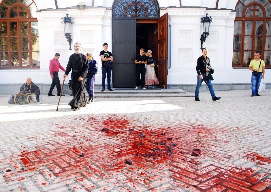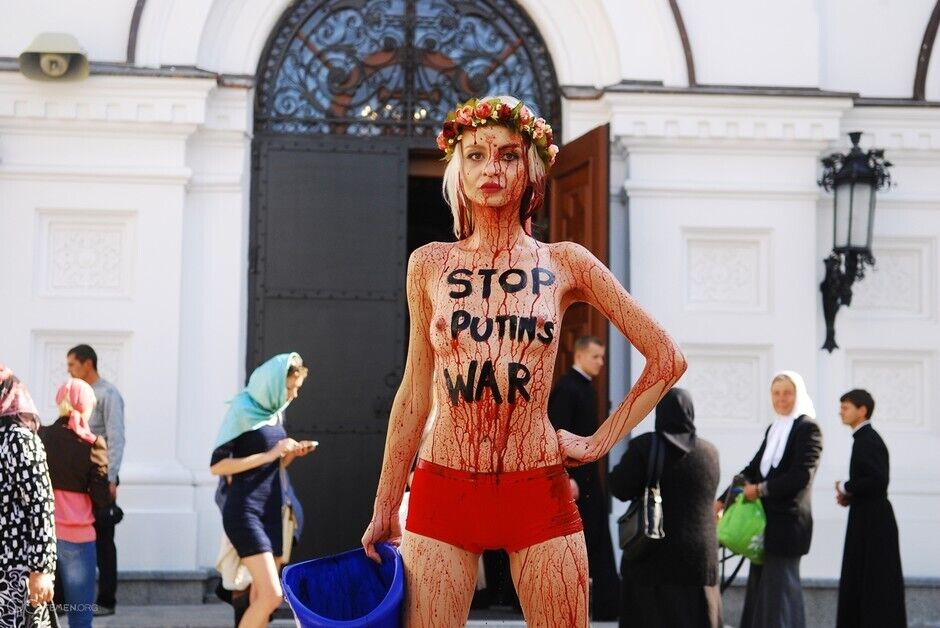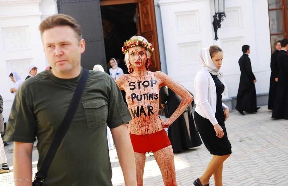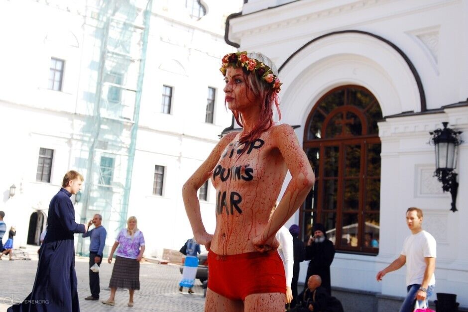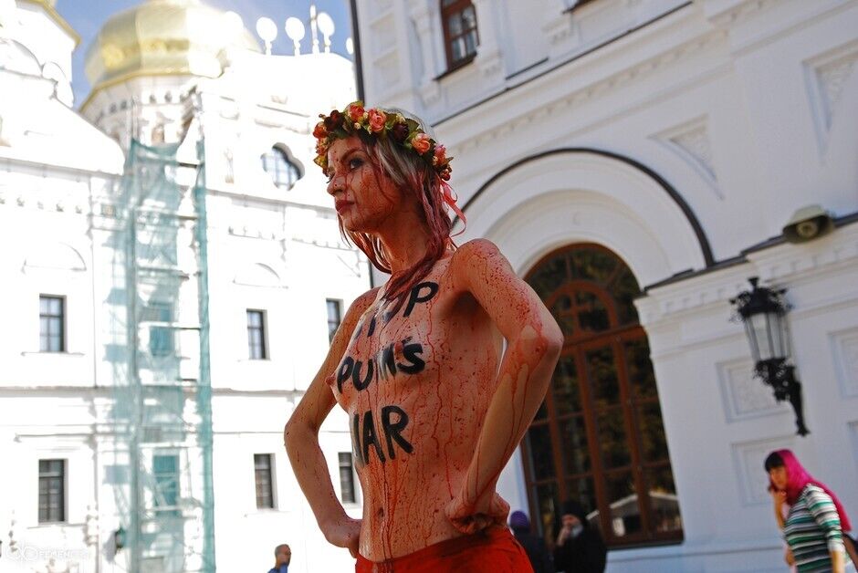 Участница общественной организации Femen облилась ведром "крови" на территории Киево-Печерской Лавры. По аналогии с IceBucketChallenge активистка заявила, что "приняла эстафету от главы РФ Владимира Путина", которого Femen обвиняют в терроре и массовых убийствах на востоке Украины. Осуждают в организации и позицию Православной Церкви Московского Патриархата, которая поддерживает политику Кремля.