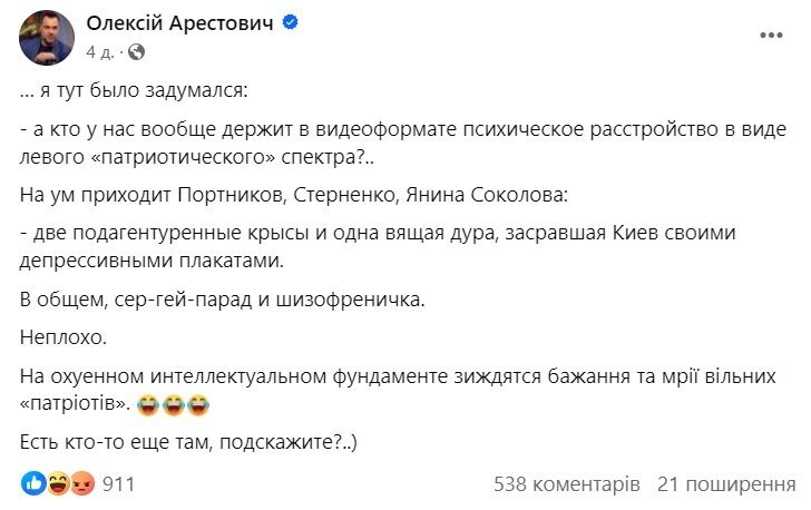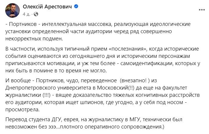 После этого Арестович опубликовал в Facebook несколько постов, в которых оскорблял Фейгина и Портникова. В частности, 28 мая он намекал, что публицист якобы является российским шпионом, потому что учился в Москве, а также называл его "подагентурной крысой".