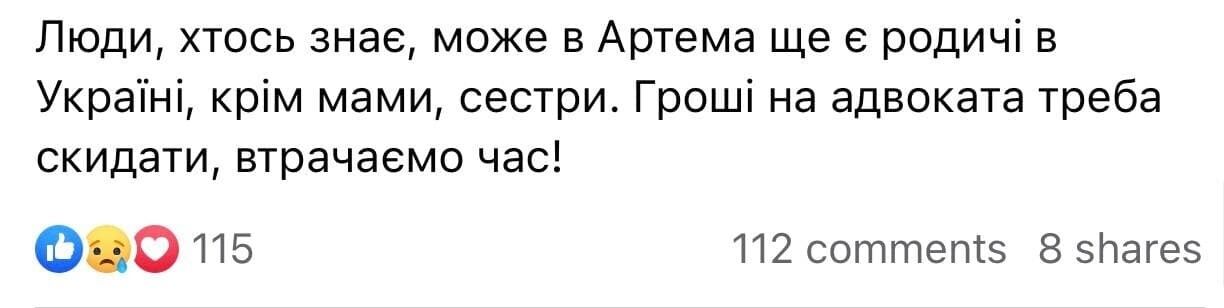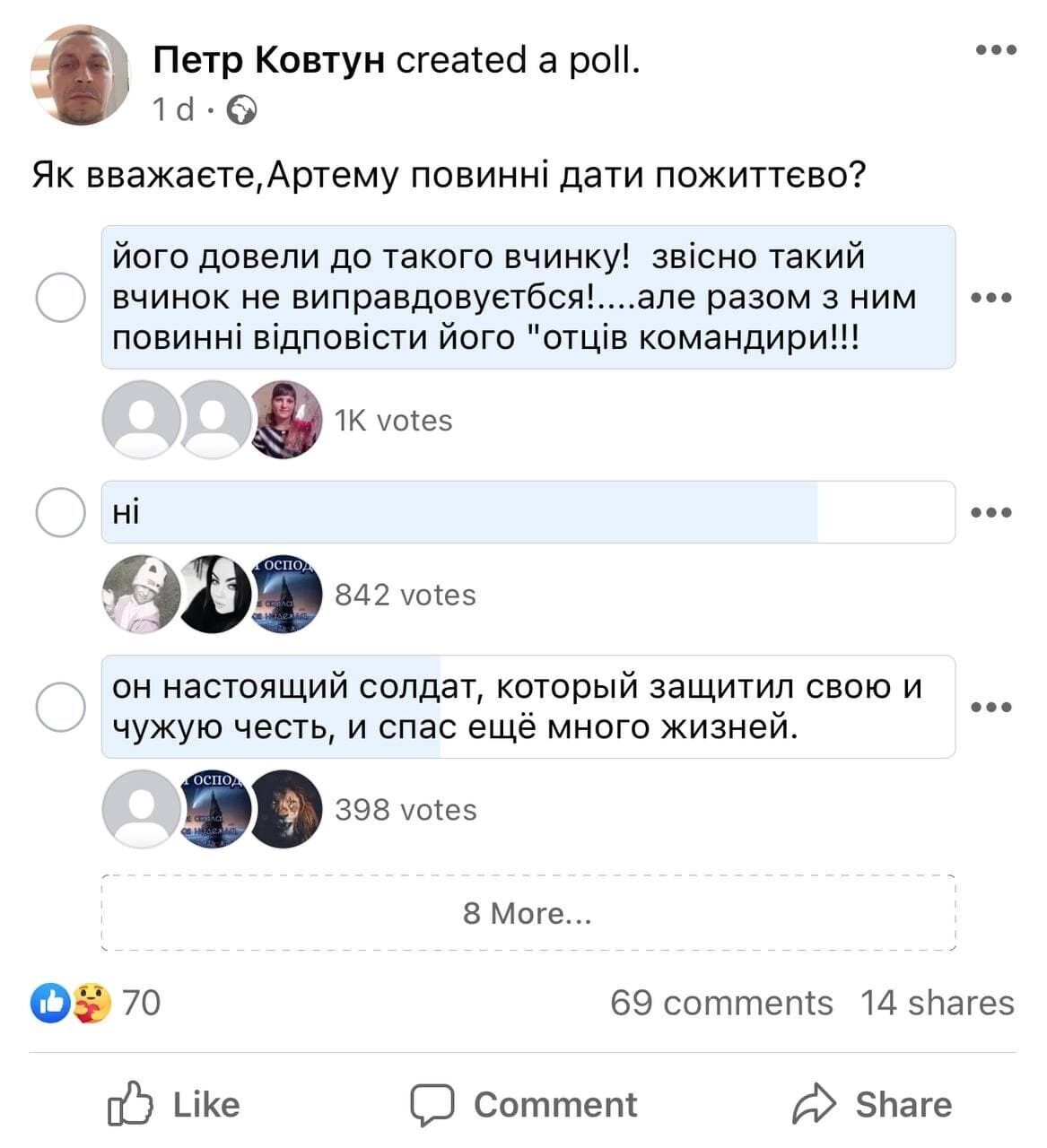 "Артем, держись, мы с тобой!", "Жаль, очень жаль! Это же как его все достало", "Нет дыма без огня, я за Артема", "Артем из моего города! Светлый мальчик, прекрасное воспитание!", "Его просто довели! Жаль, что он не пустил по пуле в лоб своим командирам!" – пишут участники группы.